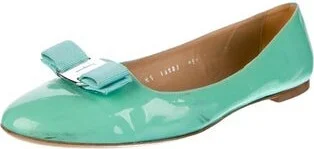 Salvatore Ferragamo Patent Leather Ballet Flats Blue Semi-Pointed Toes with Bow Accents Includes Box Fit: This style typically runs a half size small.