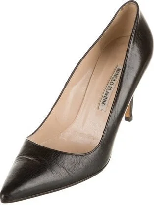 Manolo Blahnik Leather Pumps Black Pointed-Toes Fit: This style typically runs narrow and a half size small. Unfortunately, due to restrictions, this item may not be eligible for shipping in all areas.