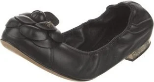 Chanel Leather Flats From the 2014 Collection by Karl Lagerfeld Black Interlocking CC Logo & Camellia Accent Round-Toes Designer Fit: This style typically runs narrow and a half size to a full size sm Read more