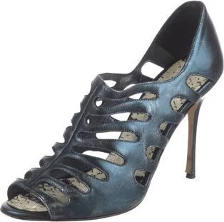 Manolo Blahnik Leather T-Strap Pumps Blue Peep-Toes Multistrap Fit: This style typically runs narrow and a half size small. Unfortunately, due to restrictions, this item may not be eligible for shipping in all areas.
