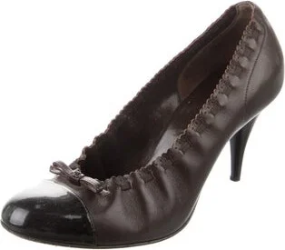 Chanel Leather Pumps By Karl Lagerfeld Brown Interlocking CC Logo Patent Leather Trim Scalloped & Bow Accents Round-Toes Designer Fit: This style typically runs narrow and a half size small. Unfortuna Read more