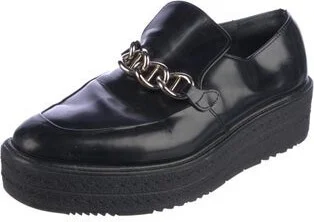 Prada Leather Loafers Black Round-Toes with Chain-Link Accents Platform Designer Fit: Flats by Prada typically run a half size small. Unfortunately, due to restrictions, this item may not be eligible for shipping in all areas.
