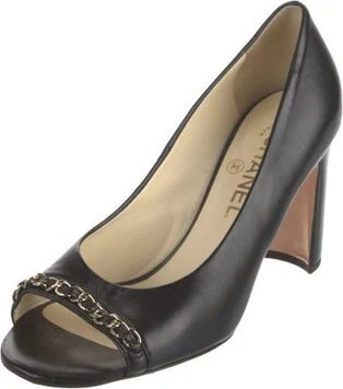 Chanel Leather Pumps By Karl Lagerfeld Black Interlocking CC Logo & Chain-Link Accent Peep-Toes with Chain-Link Accents Designer Fit: This style typically runs narrow and a half size small. Unfortunat Read more
