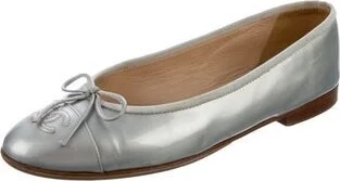Chanel Patent Leather Flats Metallic & Silver Interlocking CC Logo Grosgrain & Bow Accents Round-Toes Designer Fit: This style typically runs narrow and a half size to a full size small. Read more