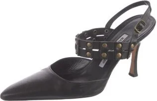 Manolo Blahnik Leather Slingback Pumps Black Semi-Pointed Toes with Studded Accents Fit: This style typically runs narrow and a half size small. Unfortunately, due to restrictions, this item may not be eligible for shipping in all areas.