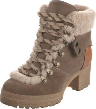 See by Chloé Suede Ankle Combat Boots Neutrals Colorblock Pattern Round-Toes Platform Wrap-Around Straps & Lace-Up Closure at Uppers Read more