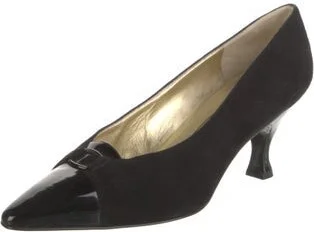 Bruno Magli Suede Pumps Black Patent Leather Trim Semi-Pointed Toes with Leather Trim Embellishment Includes Dust Bag Reconsign: Unfortunately, this brand is no longer eligible for consignment.