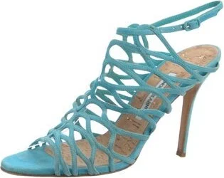 Manolo Blahnik Suede Sandals Blue Multistrap Fit: This style typically runs narrow and a half size small.