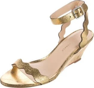 Loeffler Randall Leather Sandals Gold & Metallic Scalloped Accent Wrap-Around Straps & Buckle Closure at Ankles Unfortunately, due to restrictions, this item may not be eligible for shipping in all ar Read more