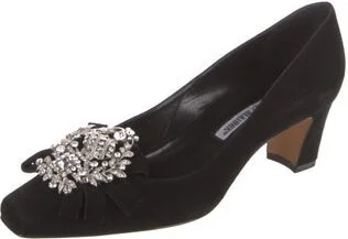 Manolo Blahnik Suede Pumps Black Square-Toes with Crystal Embellishments Fit: This style typically runs narrow and a half size small. Read more