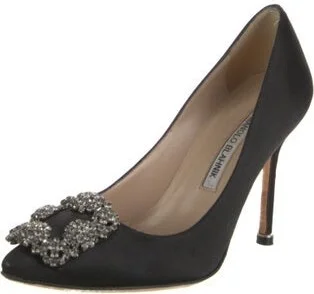 Manolo Blahnik Satin Pumps Black Pointed-Toes with Crystal Embellishments Fit: This style typically runs narrow and a half size small.