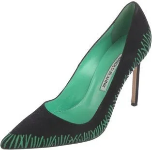 Manolo Blahnik Suede Pumps Black Printed Pointed-Toes Fit: This style typically runs narrow and a half size small. Read more