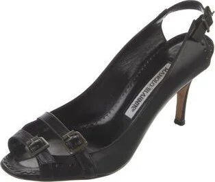 Manolo Blahnik Leather Slingback Sandals Black Buckle Closure at Ankles Fit: This style typically runs narrow and a half size small. Unfortunately, due to restrictions, this item may not be eligible for shipping in all areas.