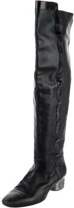 Chanel Leather Over-The-Knee Boots Black Interlocking CC Logo Patent Leather Trim Square-Toes Includes Dust Bag Fit: This style typically runs a full size small. Unfortunately, due to restrictions, th Read more