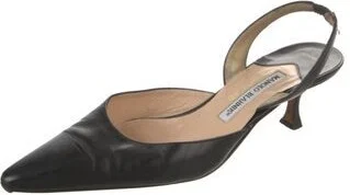 Manolo Blahnik Leather Slingback Pumps Black Semi-Pointed Toes Fit: This style typically runs narrow and a half size small. Unfortunately, due to restrictions, this item may not be eligible for shipping in all areas.