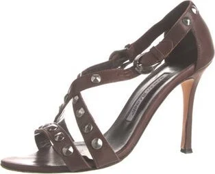 Manolo Blahnik Leather Slingback Sandals Brown Studded Accents Multistrap Fit: This style typically runs narrow and a half size small. Unfortunately, due to restrictions, this item may not be eligible for shipping in all areas.