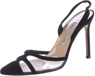 Manolo Blahnik Suede Slingback Pumps Black Semi-Pointed Toes Includes Box Fit: This style typically runs narrow and a half size small. Read more