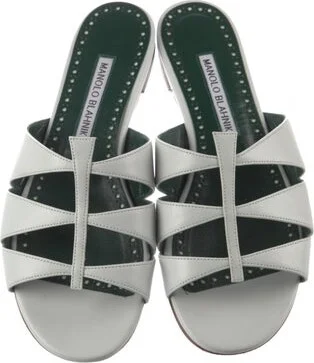 Manolo Blahnik Leather Slides White Multistrap Includes Dust Bag Fit: This style typically runs narrow and a half size small. Unfortunately, due to restrictions, this item may not be eligible for shipping in all areas.