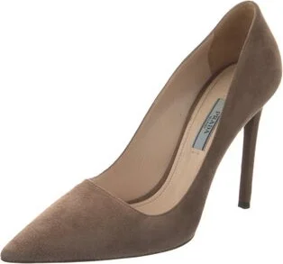 Prada Suede Pumps Brown Leather Trim Semi-Pointed Toes Designer Fit: Pumps by Prada typically run a half size small.