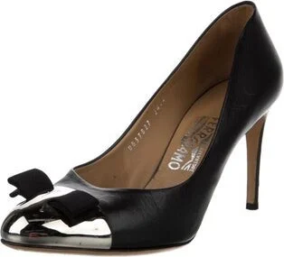 Salvatore Ferragamo Leather Pumps Black Colorblock Pattern Grosgrain & Bow Accents Round-Toes Fit: This style typically runs a half size small. Unfortunately, due to restrictions, this item may not be Read more