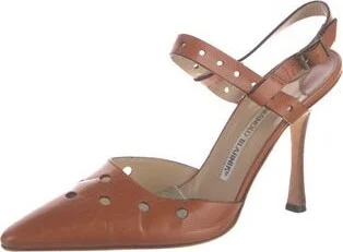 Manolo Blahnik Leather Slingback Pumps Brown Semi-Pointed Toes Buckle Closure at Ankles Fit: This style typically runs narrow and a half size small. Unfortunately, due to restrictions, this item may not be eligible for shipping in all areas.