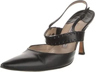 Manolo Blahnik Leather Slingback Pumps Black Semi-Pointed Toes Buckle Closure at Ankles Fit: This style typically runs narrow and a half size small. Unfortunately, due to restrictions, this item may n Read more