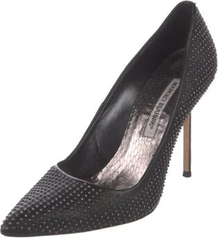 Manolo Blahnik Leather Pumps Black Semi-Pointed Toes with Studded Accents Fit: This style typically runs narrow and a half size small. Unfortunately, due to restrictions, this item may not be eligible for shipping in all areas.