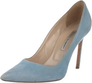 Manolo Blahnik Suede Pumps Blue Leather Trim Semi-Pointed Toes Fit: This style typically runs narrow and a half size small. Read more