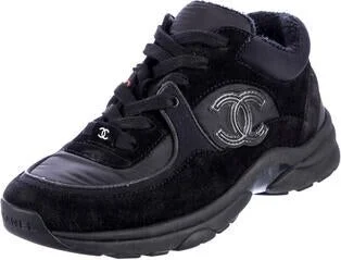 Chanel Suede Low Top Sneakers Black Interlocking CC Logo Nylon Trim Round-Toes Lace-Up Closure at Uppers Includes Box & Additional Laces Designer Fit: This style typically runs narrow and a half size small.