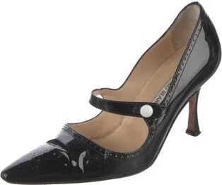 Manolo Blahnik Patent Leather Pumps Black Semi-Pointed Toes Mary Jane Strap Includes Dust Bag Fit: This style typically runs narrow and a half size small. Read more
