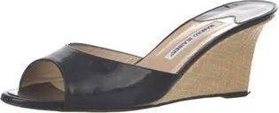 Manolo Blahnik Patent Leather Slides Black & Neutrals Includes Box & Dust Bag Fit: This style typically runs narrow and a half size small. Read more