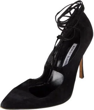 Manolo Blahnik Suede Pumps Black Pointed-Toes Wrap-Around Straps & Tie Closures Fit: This style typically runs narrow and a half size small. Read more
