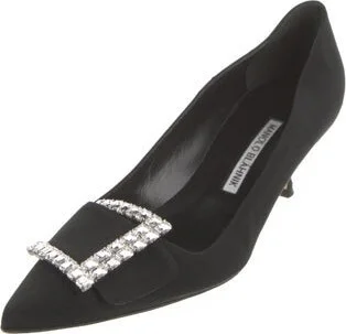 Manolo Blahnik Satin Pumps Black Semi-Pointed Toes with Crystal Embellishments Fit: This style typically runs narrow and a half size small.
