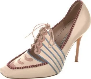 Manolo Blahnik Leather Pumps Neutrals Striped Semi-Pointed Toes Fit: This style typically runs narrow and a half size small. Unfortunately, due to restrictions, this item may not be eligible for shipping in all areas.