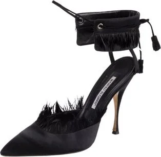 Manolo Blahnik Satin D'Orsay Pumps Black Fur & Tassel Accents Pointed-Toes Wrap-Around Straps & Tie Closures Fit: This style typically runs narrow and a half size small. Read more