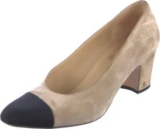 Chanel Suede Pumps Brown Interlocking CC Logo Square-Toes Designer Fit: This style typically runs narrow and a half size small.