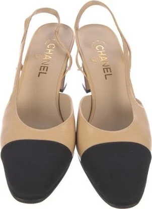 Chanel Leather Slingback Pumps Neutrals Interlocking CC Logo Square-Toes Includes Dust Bag Designer Fit: This style typically runs narrow and a half size small. Unfortunately, due to restrictions, thi Read more