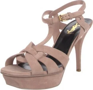 Saint Laurent Suede T-Strap Sandals Neutrals Leather Trim Platform Crossover Straps & Buckle Closure at Ankles Includes Box, Dust Bag & Additional Heel Caps Fit: Sandals by Saint Laurent typically run Read more