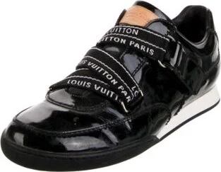 Louis Vuitton Patent Leather Low Top Sneakers Black Leather Trim Round-Toes Velcro Closure at Sides Designer Fit: Sneakers by Louis Vuitton typically run a half size small. Read more