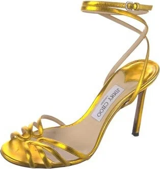 Jimmy Choo Leather Sandals Gold Wrap-Around Straps & Buckle Closure at Ankles Size not listed, estimated from measurements. Fit: This style typically runs a full size small. Unfortunately, due to restrictions, this item may not be eligible for shipping in all areas.