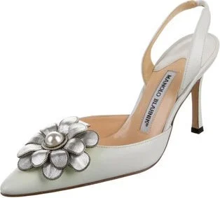 Manolo Blahnik Leather Slingback Pumps White Semi-Pointed Toes Includes Dust Bag Fit: This style typically runs narrow and a half size small. Unfortunately, due to restrictions, this item may not be eligible for shipping in all areas.
