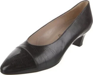 Chanel Leather Pumps Black Interlocking CC Logo Patent Leather Trim Semi-Pointed Toes Designer Fit: This style typically runs narrow and a half size small. Unfortunately, due to restrictions, this item may not be eligible for shipping in all areas.