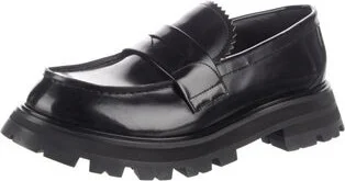 Alexander McQueen Leather Loafers Black Round-Toes with Scalloped Accent Platform Includes Box Unfortunately, due to restrictions, this item may not be eligible for shipping in all areas. Read more