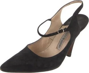 Manolo Blahnik Suede Slingback Pumps Black Semi-Pointed Toes Buckle Closure at Ankles Fit: This style typically runs narrow and a half size small. Read more