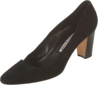 Manolo Blahnik Suede Pumps Black Semi-Pointed Toes Fit: This style typically runs narrow and a half size small.