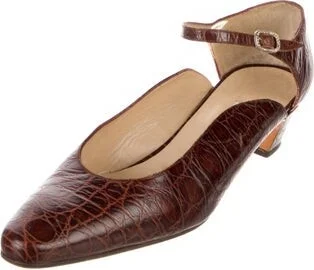 Manolo Blahnik Embossed Leather D'Orsay Pumps Brown Animal Print Semi-Pointed Toes Mary Jane Strap & Buckle Closure at Ankles Fit: This style typically runs narrow and a half size small. Read more
