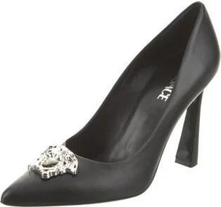 Versace Leather Pumps Black Semi-Pointed Toes Includes Box Unfortunately, due to restrictions, this item may not be eligible for shipping in all areas. Read more