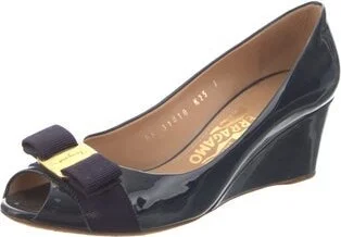 Salvatore Ferragamo Patent Leather Pumps Blue Peep-Toes with Bow Accents Fit: This style typically runs a half size small. Read more