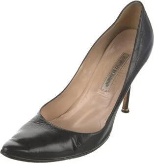 Manolo Blahnik Leather Pumps Black Pointed-Toes Fit: This style typically runs narrow and a half size small. Unfortunately, due to restrictions, this item may not be eligible for shipping in all areas Read more