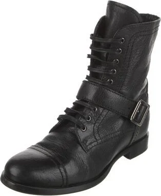 Prada Leather Mid-Calf Combat Boots Black Round-Toes Wrap-Around Straps & Lace-Up Closure at Uppers Fit: This style typically runs a half size small. Unfortunately, due to restrictions, this item may Read more